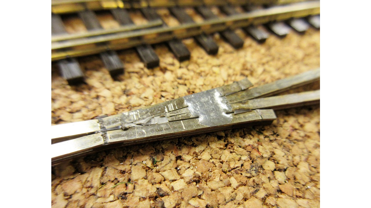 Exposing the metal from underneath is a questionable choice, largely because of the fact that the wiring strap to the frog is actually molded into the plastic track tie. And, of course, it’s not possible on the installed turnouts.