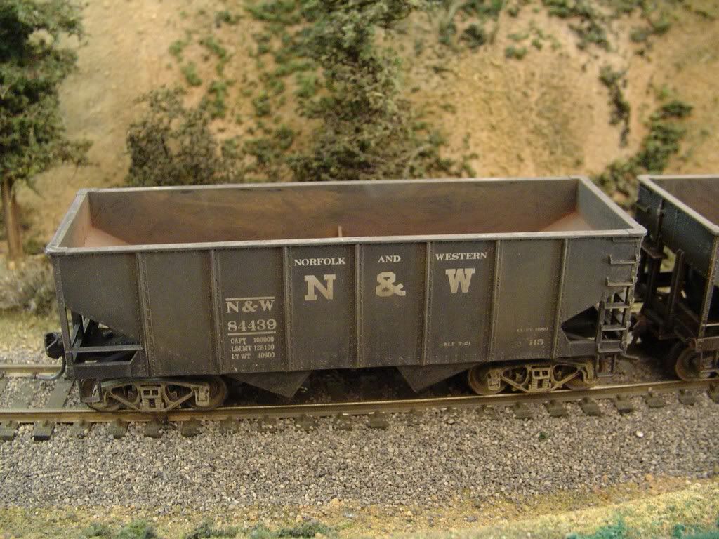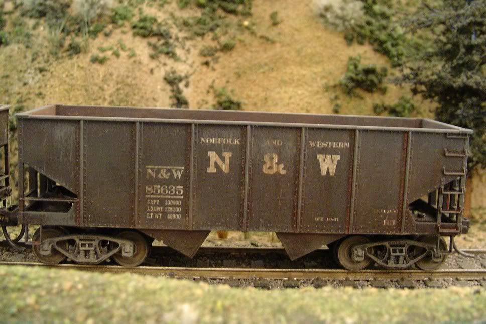 First, some general comments: All of the cars in this post are custom painted USRA 55 ton hoppers from Accurail. They’ve had Kadee couplers and Intermountain and Proto 2000 wheel sets (with 10K resistors) added.