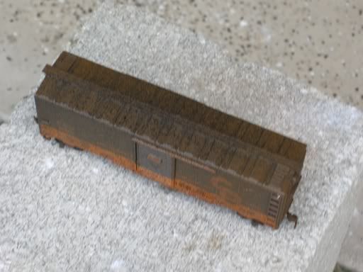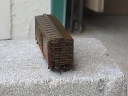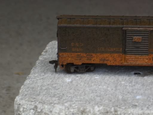 Yesterday I tried to weather a boxcar. I needed a look that said that the boxcar had been in a siding or lost in a mountain a bit too long. I needed an old, greasy, muddy look which I think I accomplished. I used an array of black and brown paint. If anybody wants to know, I’ll go into more detail. I would truely like your opinion though. It does look overweathered though…but like I said, It’s not a car used everyday.