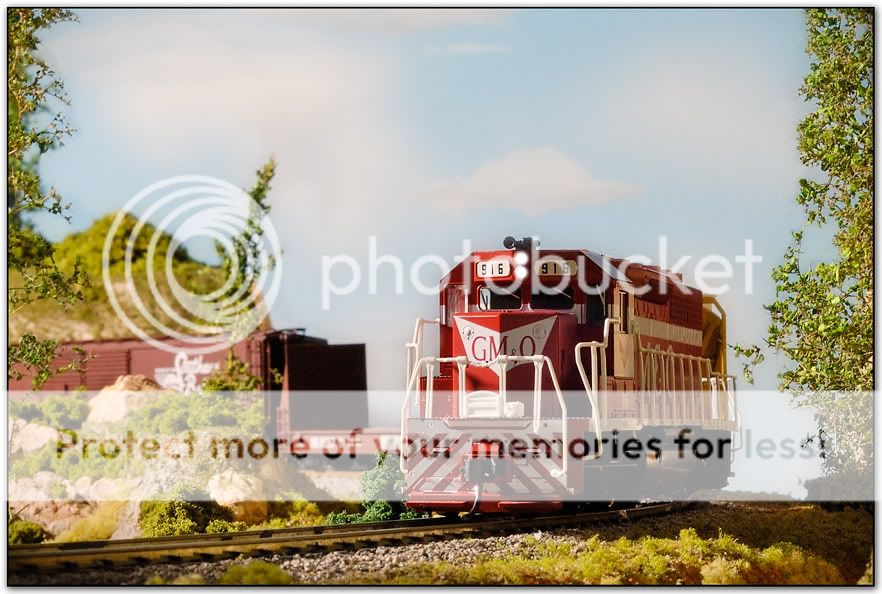 My entry for this weekend, a GM & 0 SD 40-2 made my Kato, coming upgrade and around a curve. The sky background is a ‘skyboard’ that I painted back when I was experimenting with different methods of painting a backdrop. I had a few pieces of left over masonite so I practiced on them. Shooting from this angle there isn’t an actual backdrop so I used one of my practice skyboards propped up behind the scene.