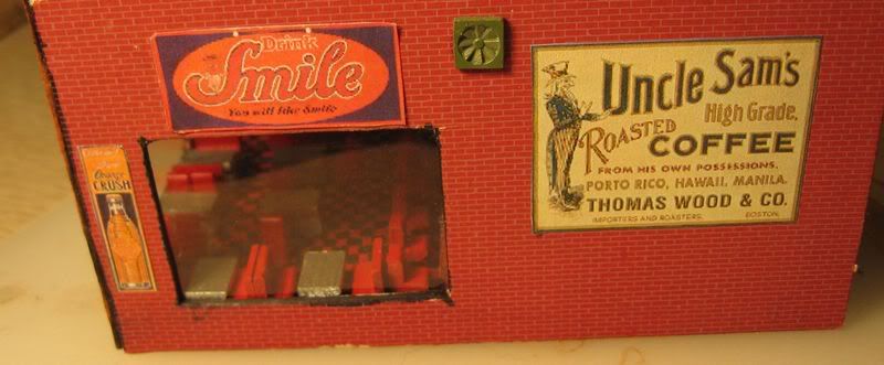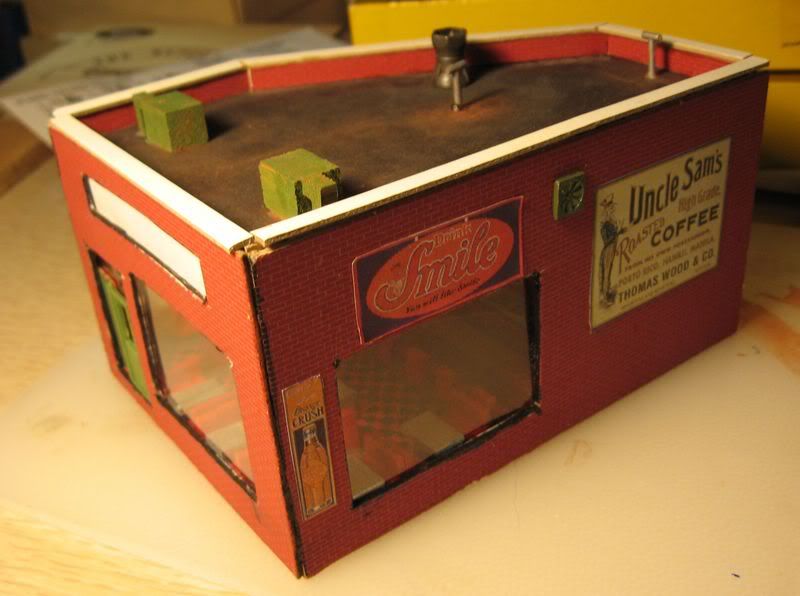 I found this cafe kit at a swapmeet a while back. You know the kind, no instuctions, missing parts, halfway started. First I added some signs, then some clear windows, put in some of the interior iteams, painted the roof and added some details. I’m going to try to frame the corners, door and windows to make them look better. The walls have some warpage, & the roof does not quite fit right. I hope to use this as a background building as the kit is of vintage standards and lacks the detail of todays kits. But the kit cost only $2.