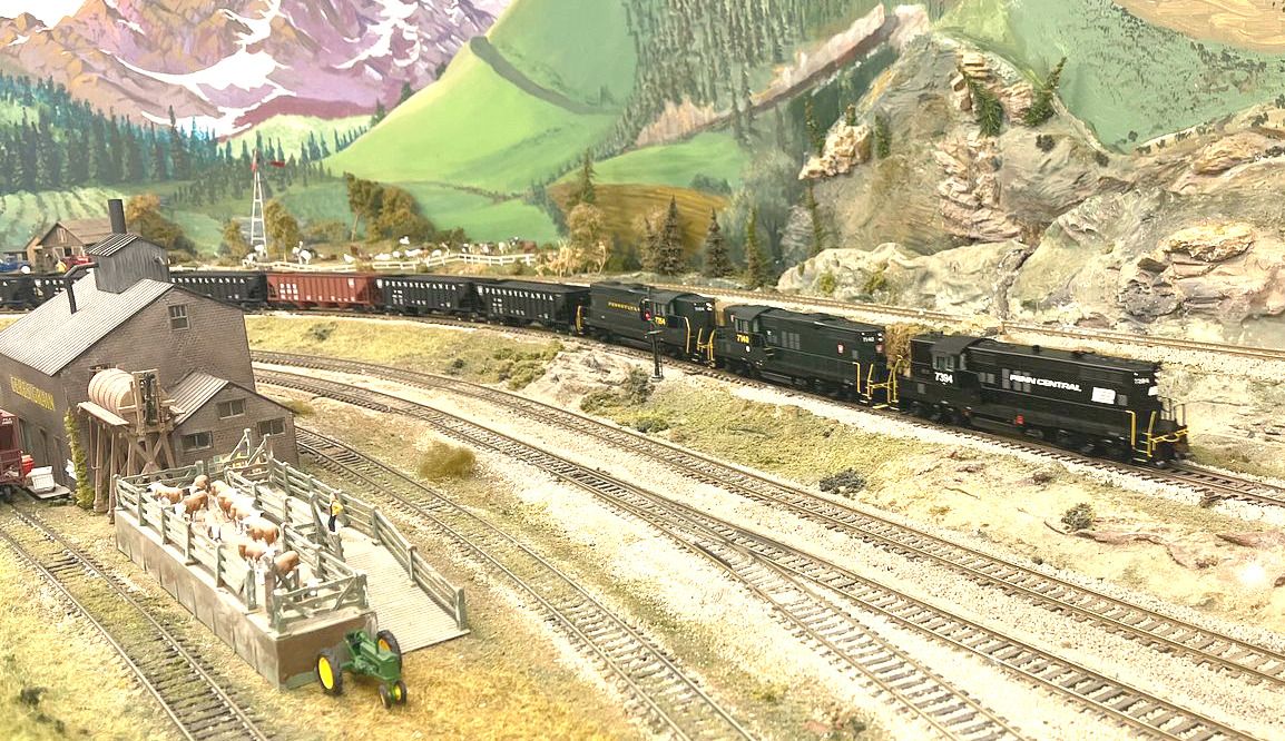 A trio of Athearn GP9’s with a coal drag on the Strongsville Club layout.