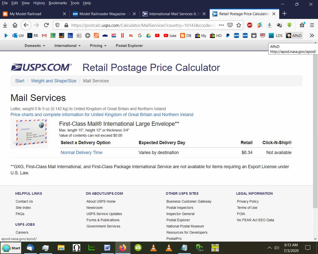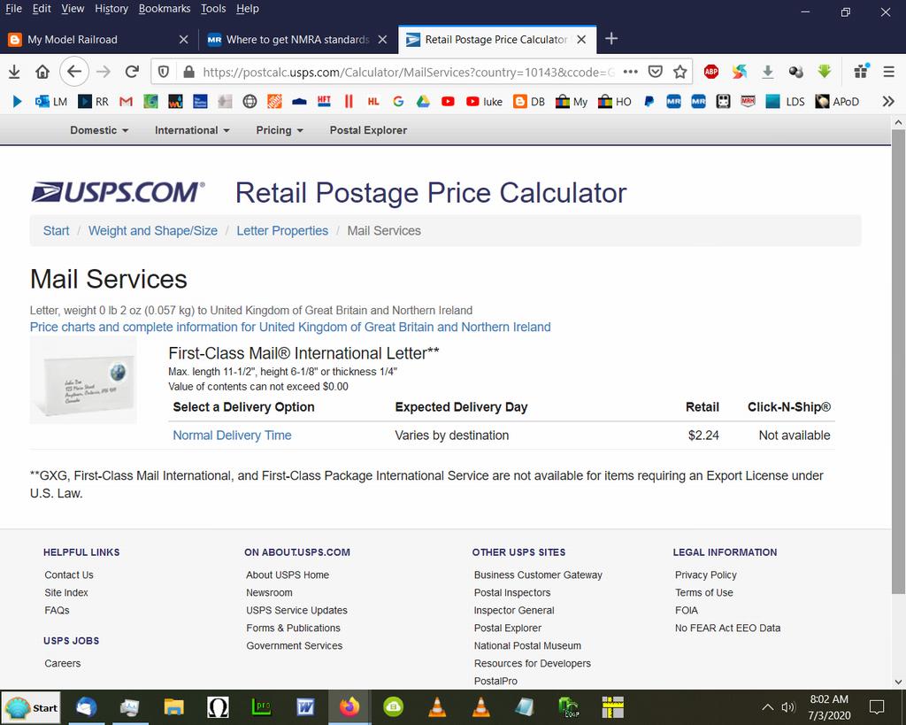 I put “Letter” in the box on USPS.com Retail Price Postage Calculator and 5oz for weight from the US to the UK and got this screen.