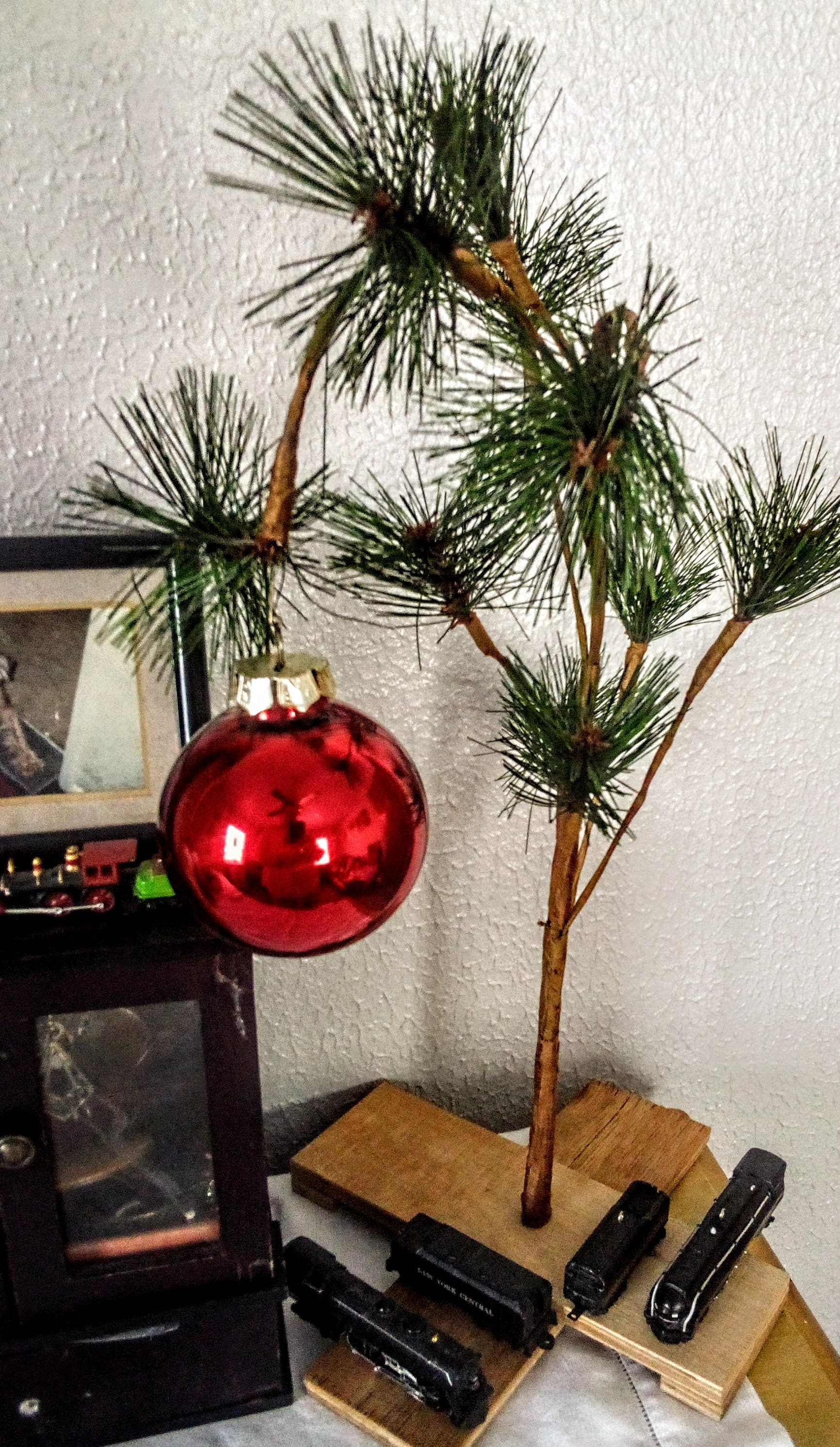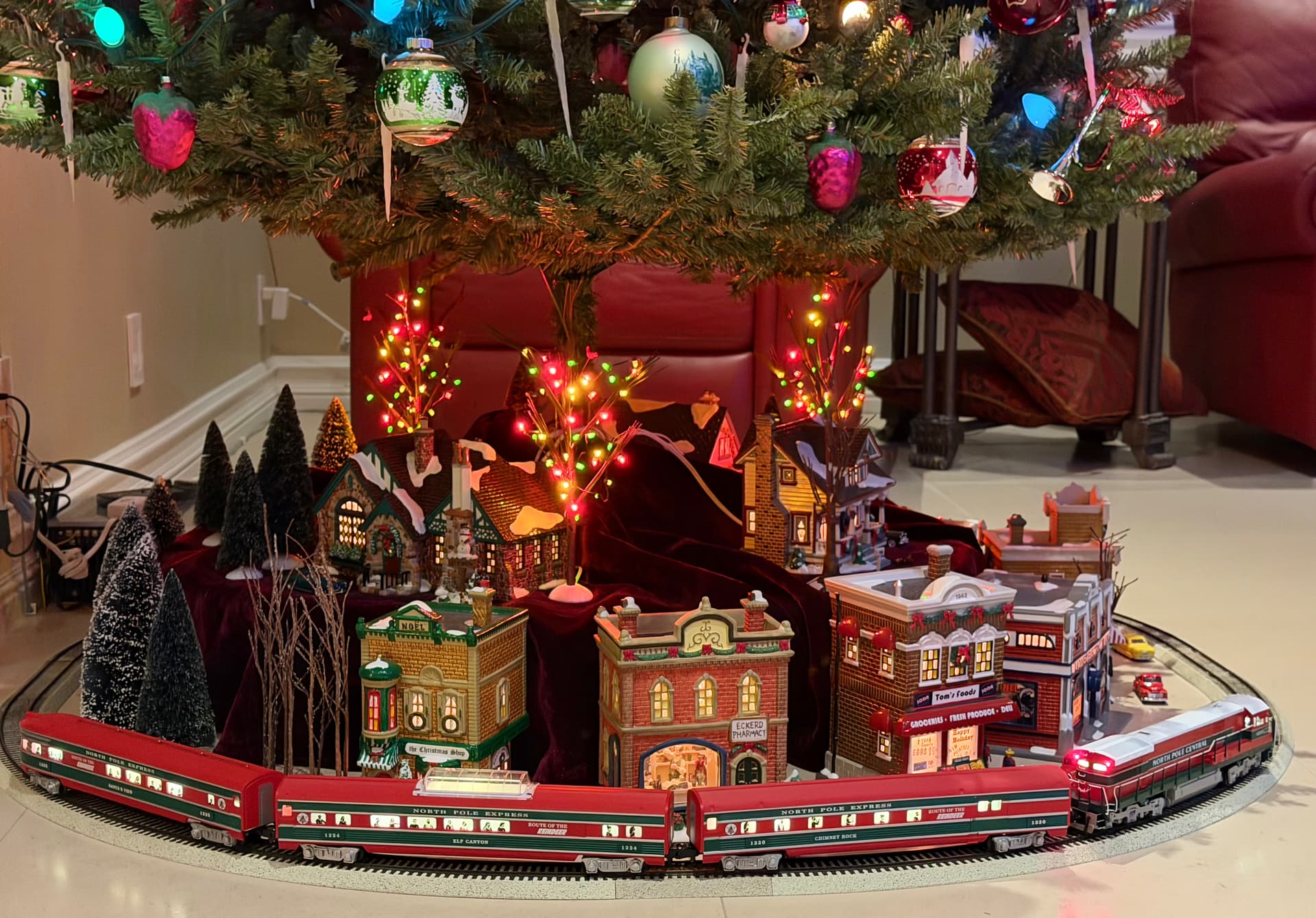 It will be at least a week until the 2025 tree is ready. To fill in, here is 2014. We had two trees that year, one real and one artificial. Both needed a train underneath.