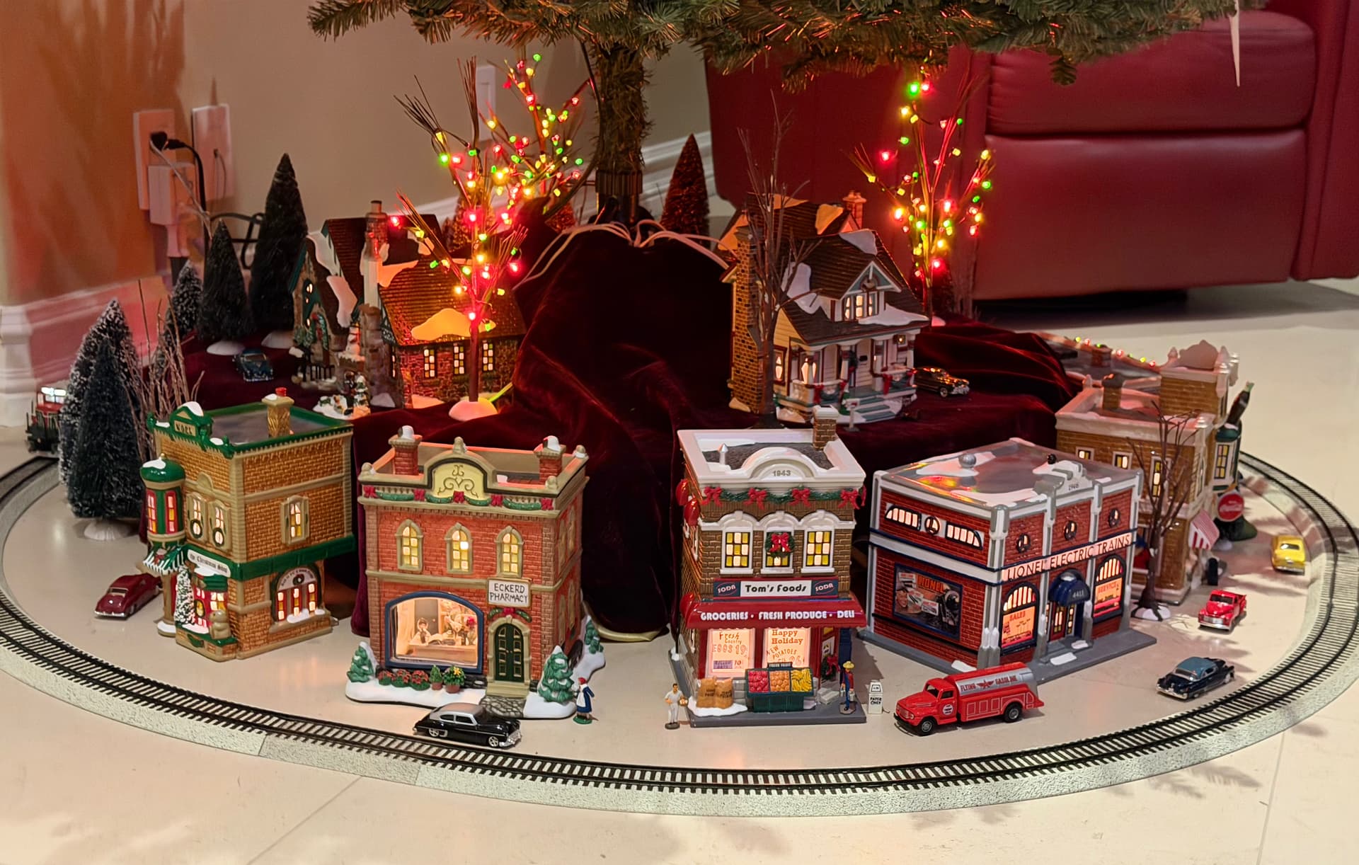 The main tree in the family room has a 55” diameter circle of track With a Christmas passenger train pulled by the only Legacy equipped Christmas engine Lionel made in S gauge. Assorted Snow Village buildings, houses, trees are used. Some S scale cars and people are included.