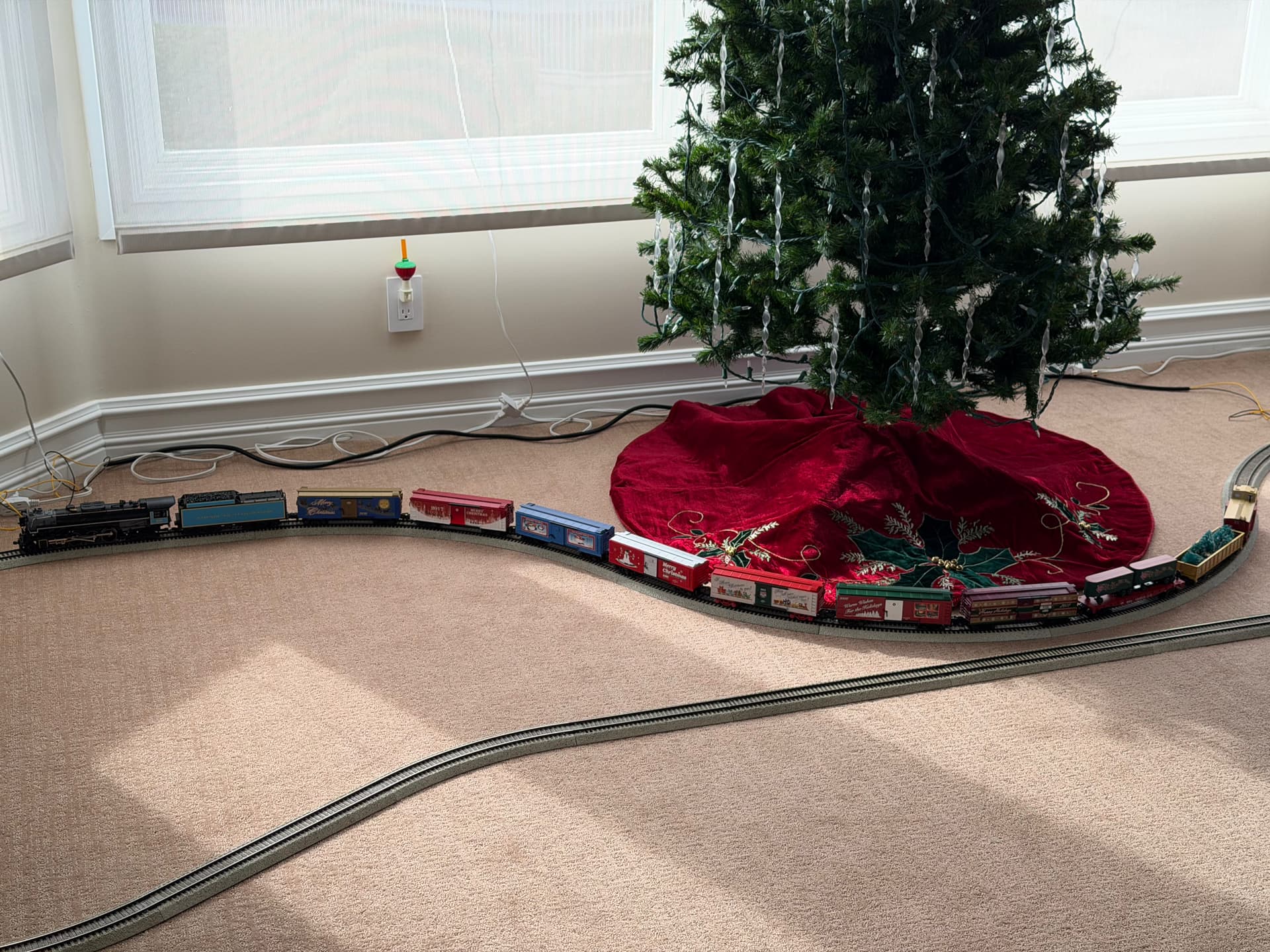 The tree in my office is simpler. It may be more correct to say the train runs past this tree rather than it being under the tree. The distorted dog bone track is 50”x166”, plenty for a Legacy Berkshire pulling a 10 car Christmas freight.