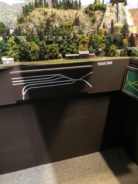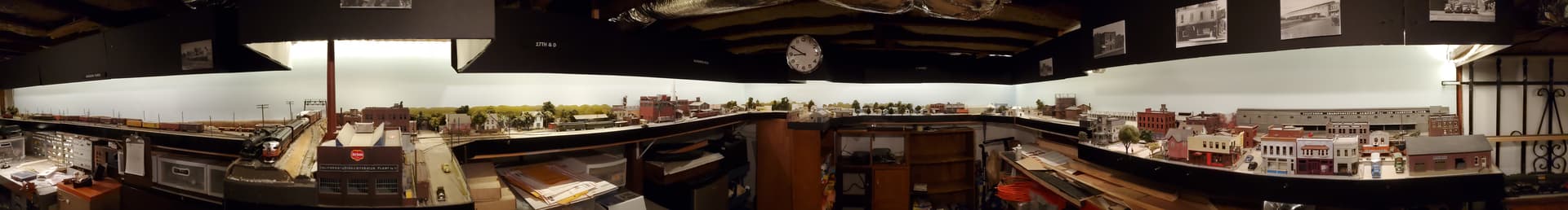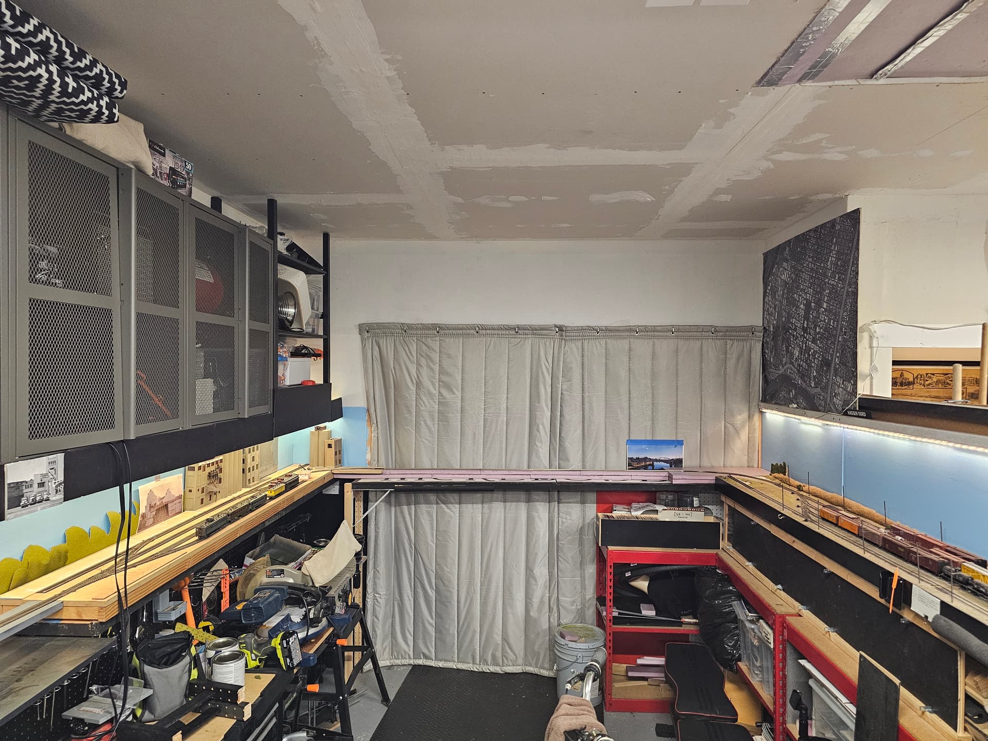 The layout room is a 15.25’x23’ garage, with a 4.5’x4’ bathroom next to the garage door curtain (on the right in the lower photo.) The layout was U-shaped in its previous incarnation, in an 11x25 foot basement room, and was adapted to the garage by narrowing and shortening 2 of the sections by ~2 feet. So what you see on the left in the top photo is not a peninsula but the main layout. This is the layout’s second move, it’s all built of sections (no more than 3’x6’, mostly 1’ wide) that sit on open frame shelving, held together by C-clamps, Wago connectors, and gravity.