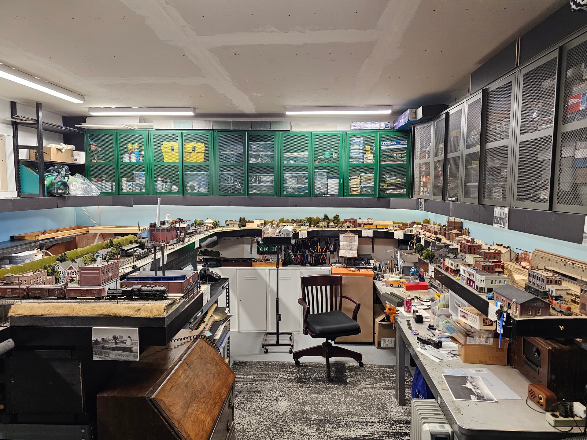 I suppose I don’t feel quite so bad about my own workbench now, but mine is often fairly cluttered–right now it’s worse than this because I’m flipping my entire layout 180 degrees (principally to turn a duck-under into a lift-out bridge), so all the rolling stock are sitting in boxes on the workbench! But this is how it typically looks, pre-flip.